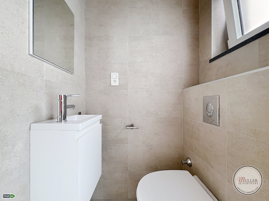 Un accès privatif au duplex, 2 emplacements de parking non couvert, une cave privative de ± 7m2, local poubelle commun, jardin commun, entrée sécurisée, parlophone, alarme, volets électriques, châssis double vitrage, chauffage au gaz, pas d’ascenseur. Provision mensuelle de charges communes de 50€. Référence PEB : RWPEB-108548 – classe A+, consommation totale d’énergie primaire du bâtiment : 4.225 kWh/an, consommation spécifique d’énergie primaire : 29 kWh/m2.an. Libre de suite !