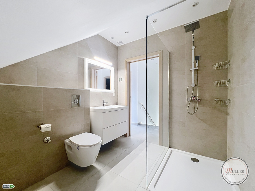 Le duplex se compose comme suit : Au premier niveau, vous trouverez un hall d’entrée de ± 14 m2, une toilette individuelle avec lave mains, une buanderie de ± 6 m2, une cuisine hyper équipée (frigo, congélateur, four, taque vitro, lave-vaisselle et hote) ouverte sur le lumineux séjour de ± 27 m2, une terrasse de ± 19m2, une première chambre de ± 8 m2. À l’étage, vous trouverez un hall de nuit de ± 4 m2, une salle de douche de ± 6 m2 équipée d’une douche à l’italienne, d’un second WC et d’un meuble lavabo. 2 chambres de ± 15 m2 et ± 19 m2, un grenier mansardé, idéal pour le rangement ou un futur aménagement.