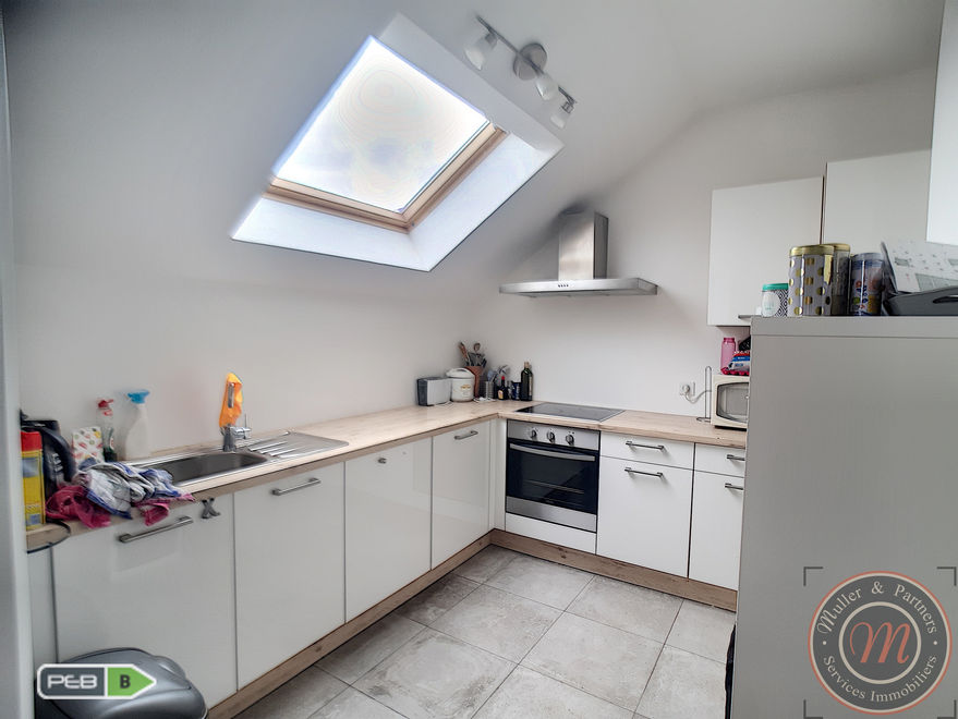 Composition : hall d’entrée, living de +-30 m² avec cuisine ouverte de +-8 m² (hyper équipée : four, taque vitro, hotte, frigo-congélateur, lave-vaisselle), débarras, agréable terrasse exposée au sud de +- 5 m² , SDD avec meuble double évier , buanderie, toilette individuelle avec lave-mains, deux chambres (9,50 m² et 12 m²) reliées entre-elles par un hall de nuit de 3 m². L’ensemble pour une surface habitable totale de +- 80 m².