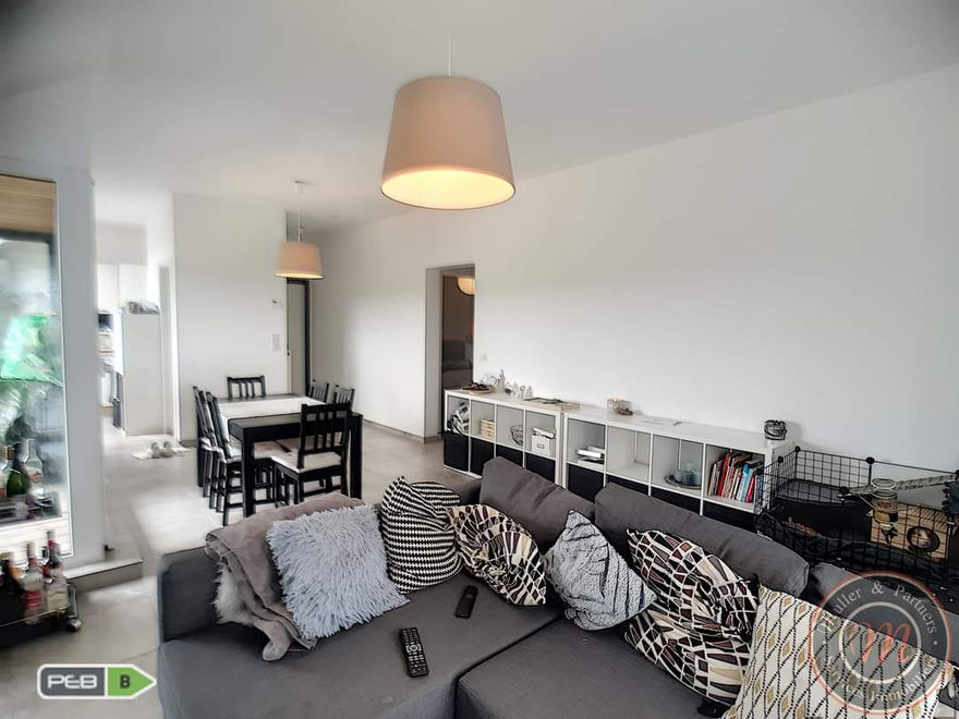 Terrasse exposée plein sud avec vue dégagée sur la campagne, chauffage central au gaz (chaudière à condensation de marque Vaillant), châssis PVC double vitrage, pas d’ascenseur, place de parking disponible devant le bâtiment, forfait pour charges communes 15€ (ne comprenant pas le gaz, eau et électricité). Déclaration PEB initiale RWPEB 021505 K41 – EW66 – ES 96.6. Libre à partir du 1er mars 2022.