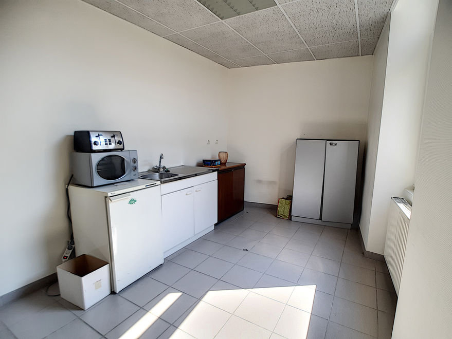 Rdc : hall d’entrée (± 4,66 m²), pièce d’accueil/côté client (±15,2 m²) avec large vitrine (4 m de long), pièce d’accueil/côté personnel (±16,49 m²), palier (±4,71 m²). Entresol : palier et couloir (±4,2 m²), bureau de gauche (±13,69 m²), bureau de droite (±11,12 m²). 1er étage : grand bureau (±43,65 m²), couloir (±2,7 m²), toilettes comprenant deux W.C. indépendants et un évier (6,78 m²), cagibi (±2,57 m²), cuisine non-équipée (±11,88 m²) et bureau (±12,92 m²).